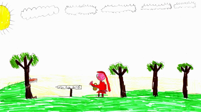 Pelo caminho encontrou uma menina de capuz vermelho com uma merenda no braço.Escondeu-se atrás da árvore e depois saltou para a comer, mas ela não fez nada, apenas ficou pasmada a olhar para ele e mostrou-lhe uma peça de fruta. O Lobo ficou com medo, olhou para um lado, olhou para o outro e encontrou uma velhinha a apanhar batatas. Só foi preciso uma dentadinha e ela já estava na barriga.