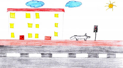 Olhou para todo o lado e via coisas com rodas de um lado para o outro e luzes a piscar cores verdes e vermelhas. Desesperado e sem saber o que fazer ficou ali muitas horas até aparecer um Lobo doce e bondoso que lhe disse: